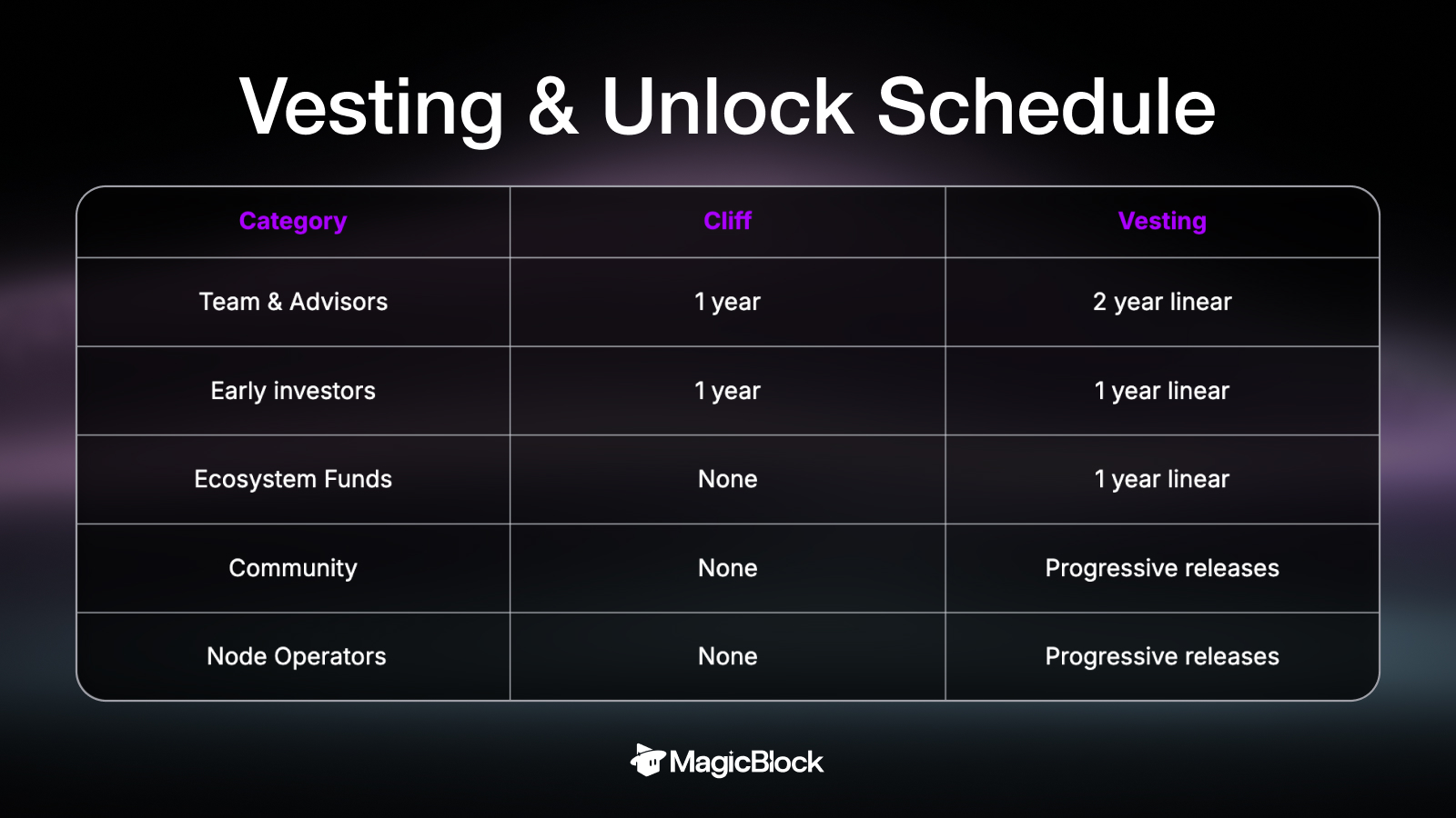 MagicBlock is building a permissionless network. $BLOCK is designed to help the protocol scale, be performant and secure: it coordinates security and performance of node operators via a staking & slashing mechanism; it is mechanically tied to protocol activity through fees (including a protocol fee path that results in $BLOCK buybacks when users pay in SOL), and it funds programmatic ecosystem incentives that directly expand onchain usage.