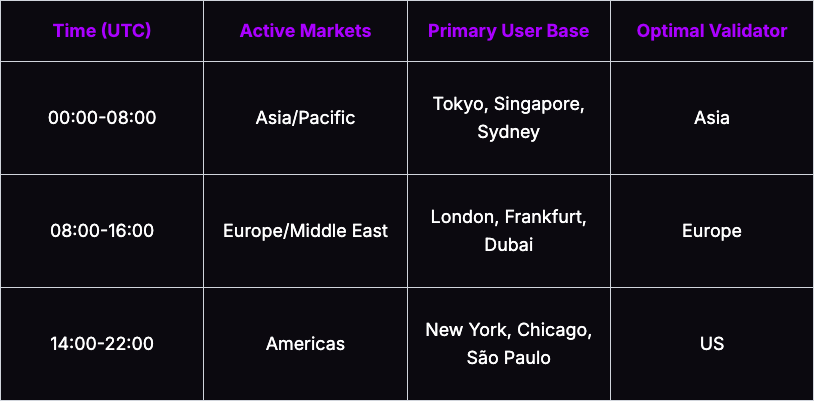 The same properties are beneficial to trading and DeFi applications, which exhibit different traffic patterns based on time and geography. Trading volume follows market opening hours, shifting across regions as markets open and close throughout the day.