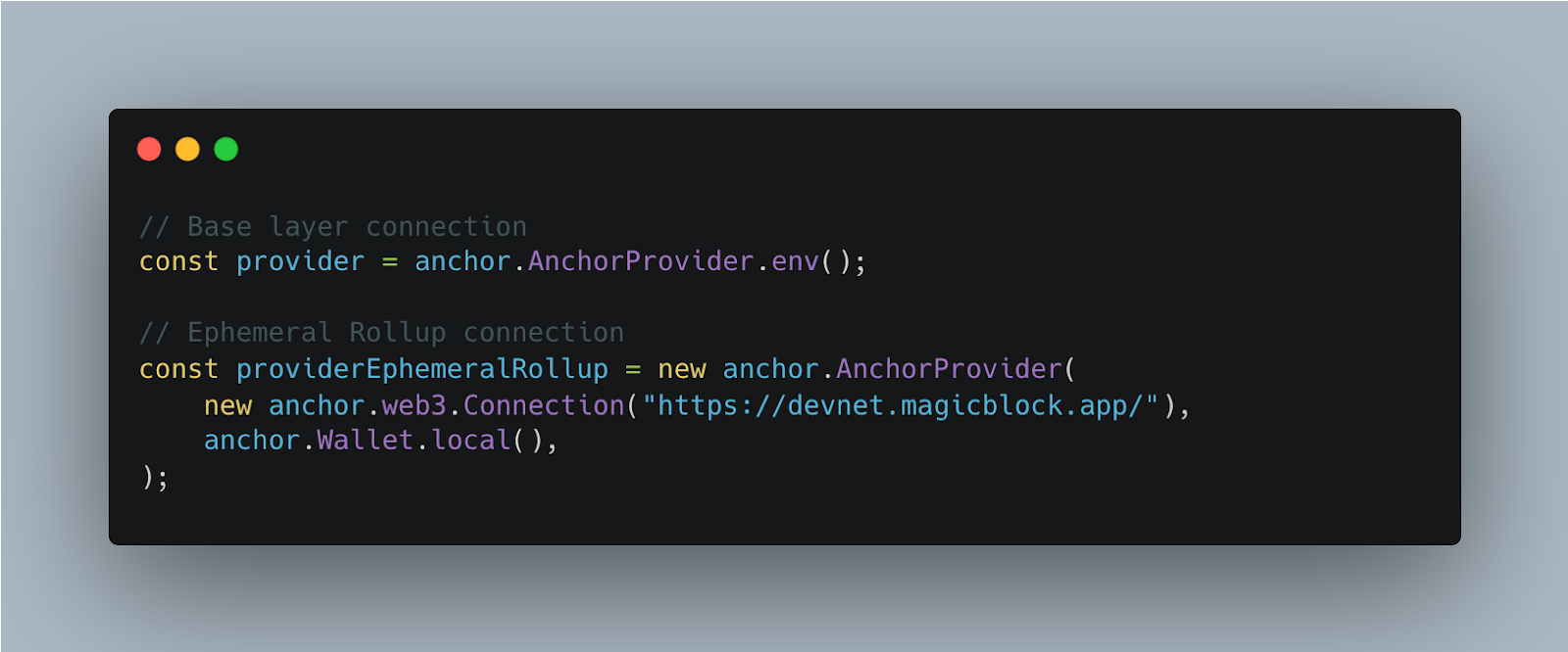 On the TypeScript side, you're juggling two connections - one to base Solana, one to the Ephemeral Rollup. To handle this automatically, you can also use the Magic Router:
