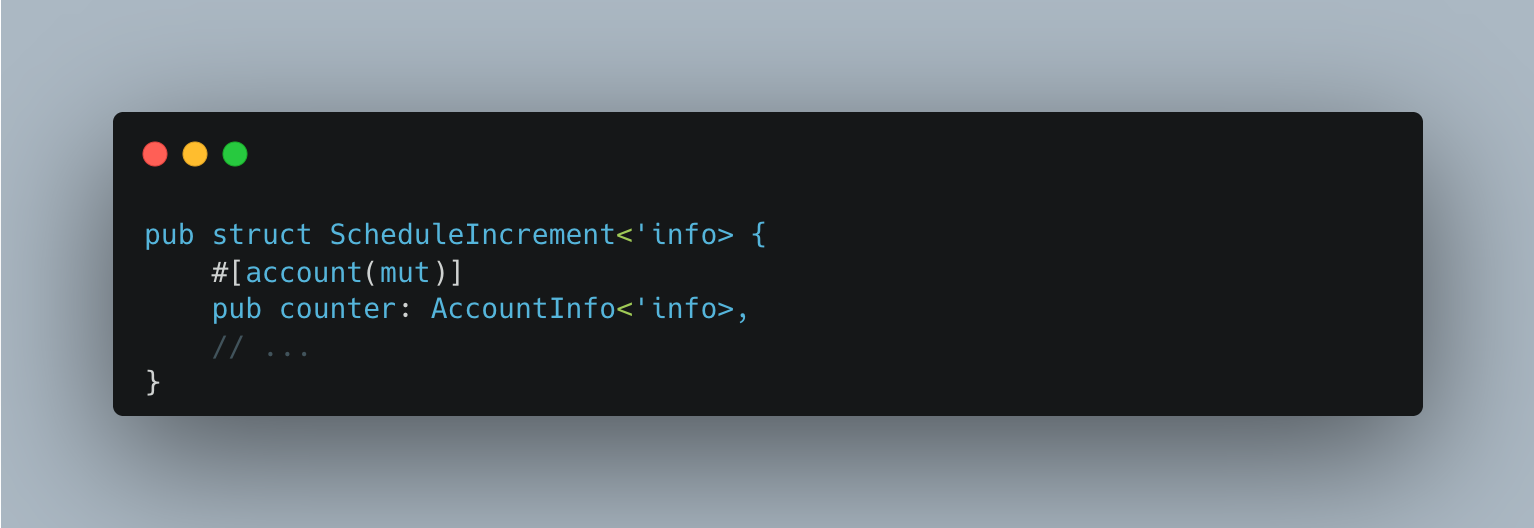 In the example repo, notice how `ScheduleIncrement` uses `AccountInfo<'info>` instead of `Account<'info, Counter>` for the counter: