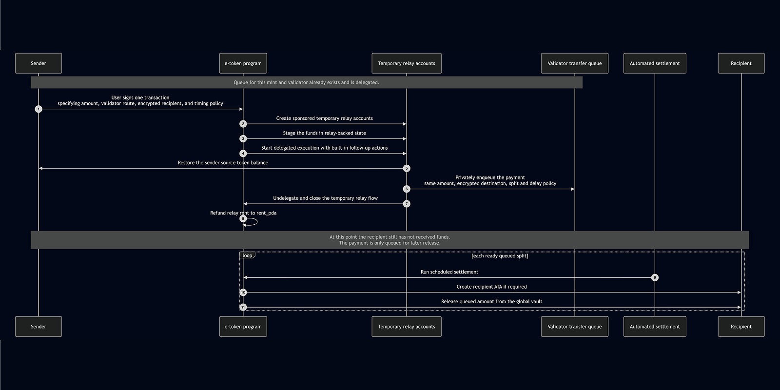 Second leg: settlement. The crank commits each payment leg from the PER back to Solana, landing USDC at the recipient address with the desired time delays and amount splits. From the perspective of onchain observers, there is no traceable link between the originating wallet and the destination.
